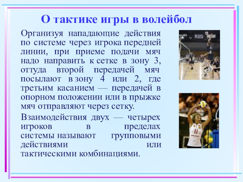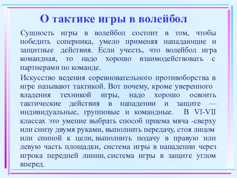 Искусство ведения соревновательного противоборства в игре называют тактикой. Вот почему, кроме уверенного владения техникой игры, надо хорошо освоить тактические действия в нападении и защите —индивидуальные, групповые и командные. В VI-VII классах это умение выбрать способ приема мяча -сверху или снизу двумя руками, выполнить передачу, стоя лицом или спиной к цели, выполнить подачу в правую или левую часть площадки, система игры в нападении через игрока передней линии, система игры в защите углом вперед.