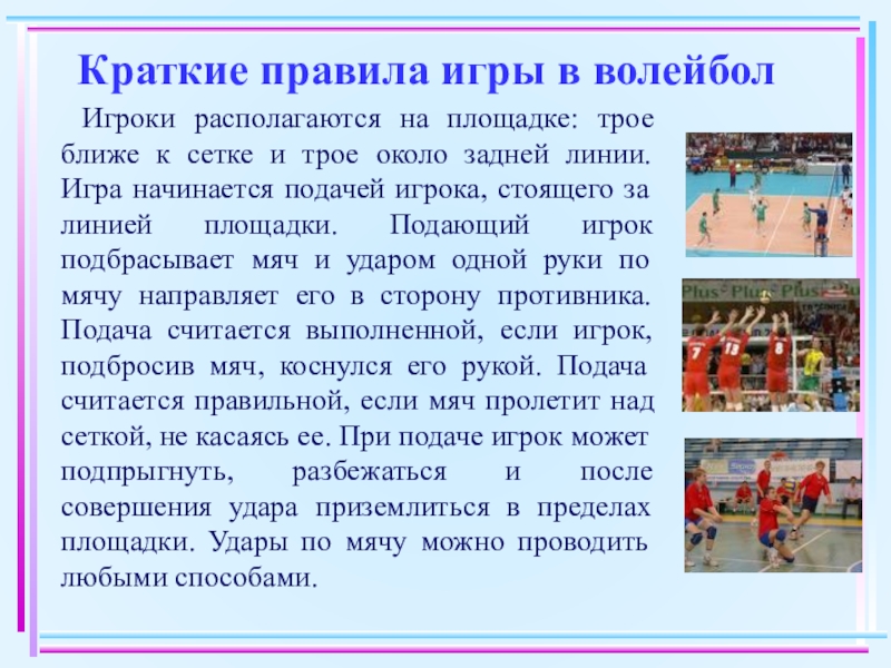 чтобы победить соперника, умело применяя нападающие и защитные действия. Если учесть, что волейбол игра командная, то надо хорошо взаимодействовать с партнерами по команде.