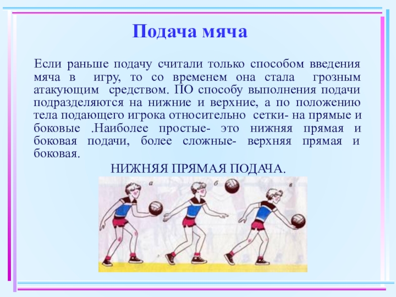 то со временем она стала грозным атакующим средством. ПО способу выполнения подачи подразделяются на нижние и верхние, а по положению тела подающего игрока относительно сетки- на прямые и боковые .Наиболее простые- это нижняя прямая и боковая подачи, более сложные- верхняя прямая и боковая.