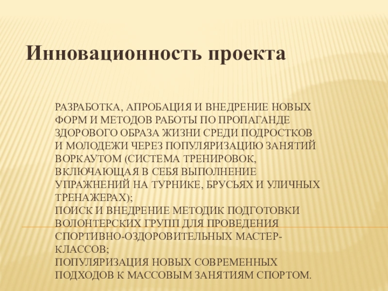 здорового образа жизни среди подростков и молодежи через популяризацию занятий воркаутом (система тренировок, включающая в себя выполнение упражнений на турнике, брусьях и уличных тренажерах);