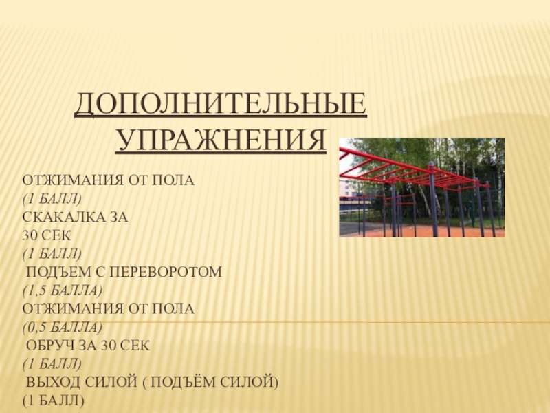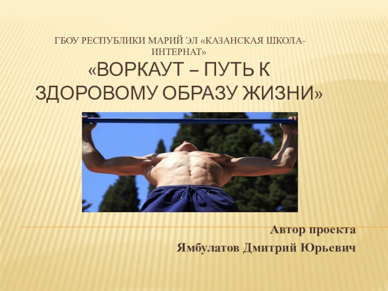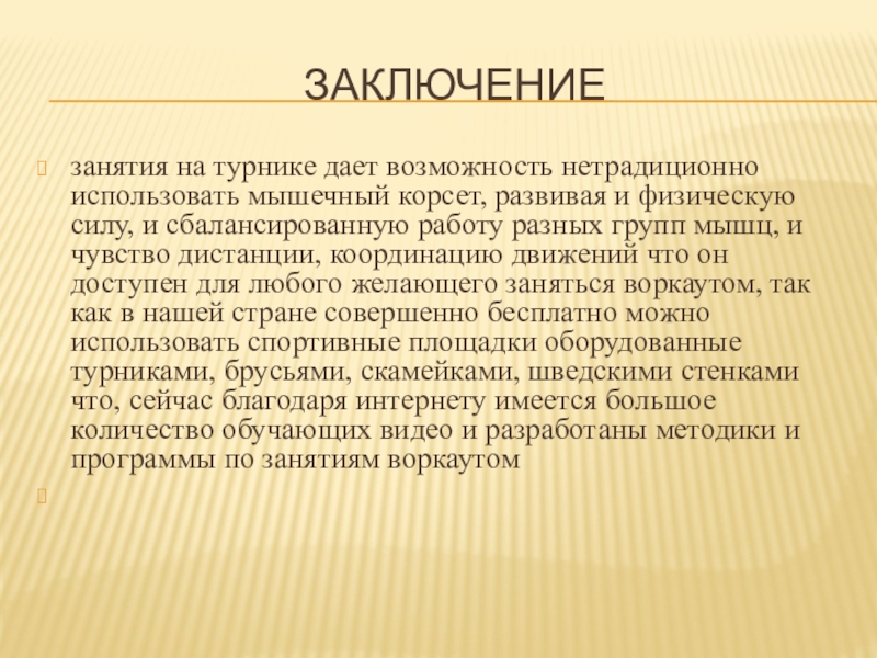 физическую силу, и сбалансированную работу разных групп мышц, и чувство дистанции, координацию движений что он доступен для любого желающего заняться воркаутом, так как в нашей стране совершенно бесплатно можно использовать спортивные площадки оборудованные турниками, брусьями, скамейками, шведскими стенками что, сейчас благодаря интернету имеется большое количество обучающих видео и разработаны методики и программы по занятиям воркаутом