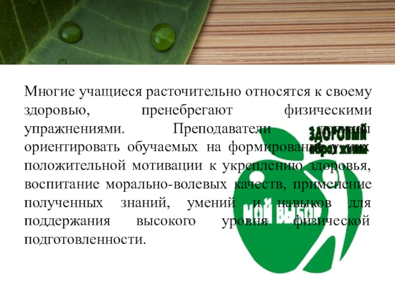 Многие учащиеся расточительно относятся к своему здоровью, пренебрегают физическими упражнениями. Преподаватели
