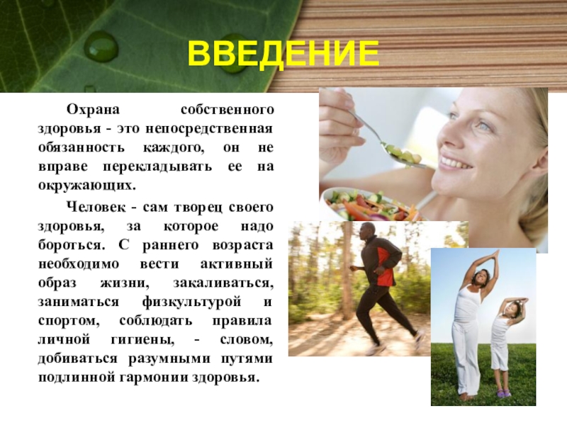 Человек - сам творец своего здоровья, за которое надо бороться. С раннего возраста необходимо вести активный образ жизни, закаливаться, заниматься физкультурой и спортом, соблюдать правила личной гигиены, - словом, добиваться разумными путями подлинной гармонии здоровья.