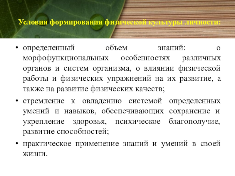 должны ориентировать обучаемых на формирование у них положительной мотивации к укреплению здоровья, воспитание морально-волевых качеств, применение полученных знаний, умений и навыков для поддержания высокого уровня физической подготовленности.