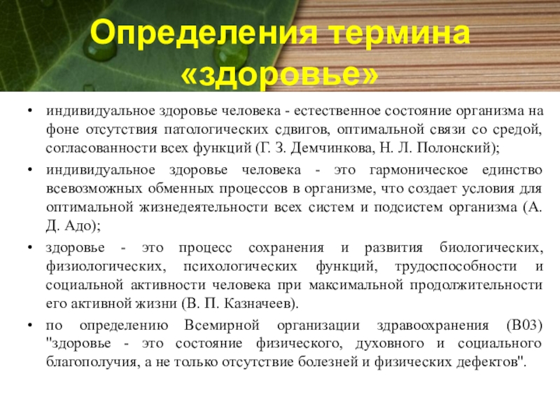 индивидуальное здоровье человека - это гармоническое единство всевозможных обменных процессов в организме, что создает условия для оптимальной жизнедеятельности всех систем и подсистем организма (А. Д. Адо);