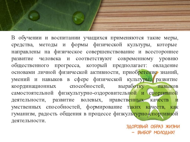 формы физической культуры, которые направлены на физическое совершенствование и всестороннее развитие человека и соответствуют современному уровню общественного прогресса, который предполагает: овладение основами личной физической активности, приобретение знаний, умений и навыков в сфере физической культуры, развитие координационных способностей, выработку навыков самостоятельной физкультурно-оздоровительной и спортивной деятельности, развитие волевых, нравственных качеств и умственных способностей, формирование таких качеств, как гуманизм, радость общения в процессе физкультурно-спортивной деятельности.