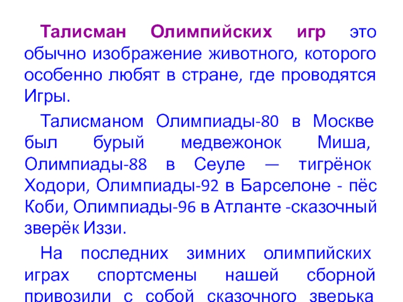 Талисманом Олимпиады-80 в Москве был бурый медвежонок Миша, Олимпиады-88 в Сеуле — тигрёнок Ходори, Олимпиады-92 в Барселоне - пёс Коби, Олимпиады-96 в Атланте -сказочный зверёк Иззи.
