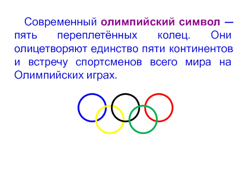 Слайд 14Современный олимпийский символ — пять переплетённых колец. Они олицетворяют единство пяти