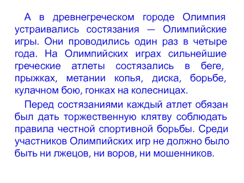 Слайд 8А в древнегреческом городе Олимпия устраивались состязания — Олимпийские игры. Они