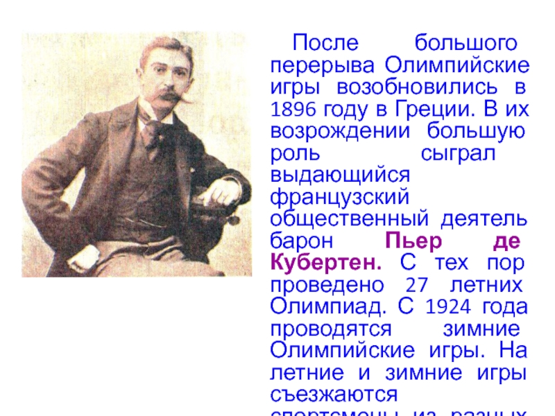 В их возрождении большую роль сыграл выдающийся французский общественный деятель барон Пьер де Кубертен. С тех пор проведено 27 летних Олимпиад. С 1924 года проводятся зимние Олимпийские игры. На летние и зимние игры съезжаются спортсмены из разных стран.