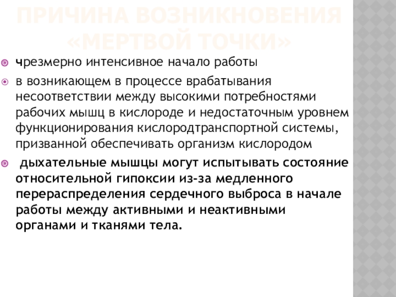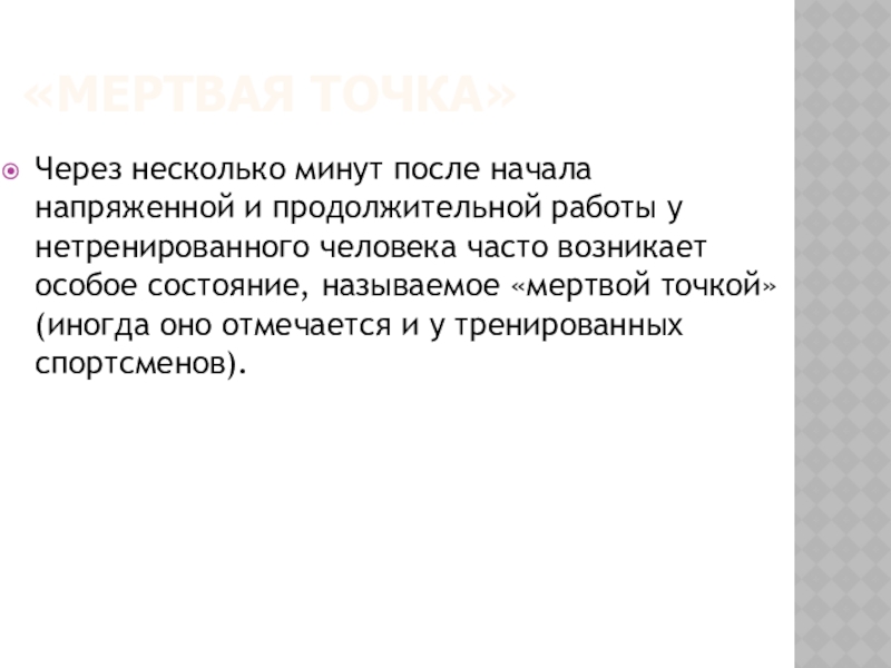 нетренированного человека часто возникает особое состояние, называемое «мертвой точкой» (иногда оно отмечается и у тренированных спортсменов).