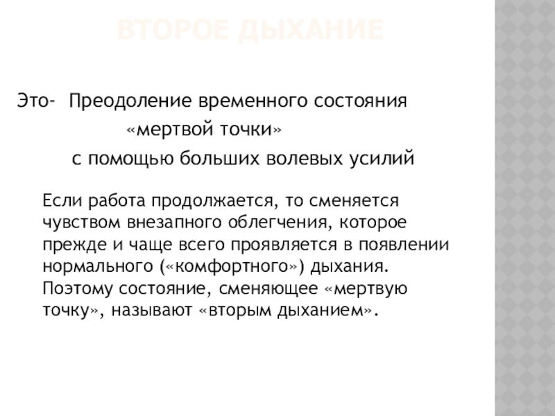 Если работа продолжается, то сменяется чувством внезапного облегчения, которое прежде и чаще всего проявляется в появлении нормального («комфортного») дыхания. Поэтому состояние, сменяющее «мертвую точку», называют «вторым дыханием».
