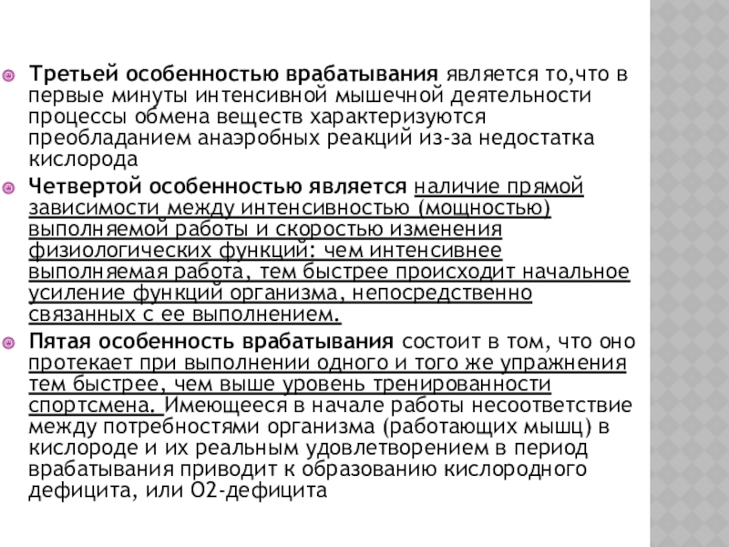 Слайд 5Третьей особенностью врабатывания является то,что в первые минуты интенсивной мышечной деятельности процессы