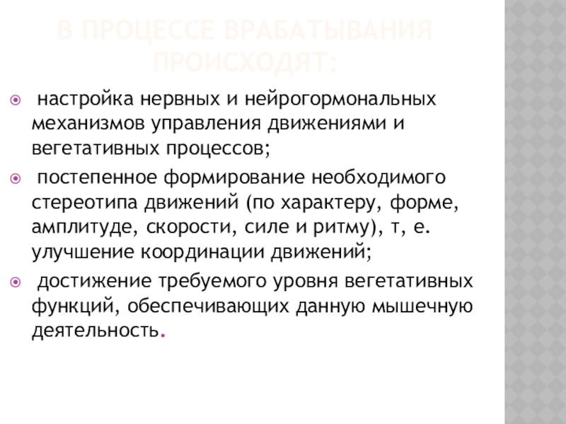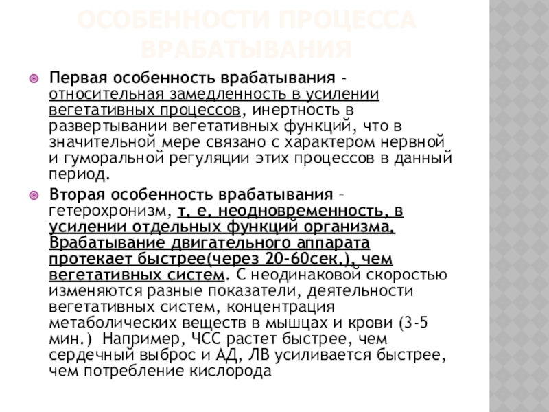 Первая особенность врабатывания - относительная замедленность в усилении вегетативных процессов,