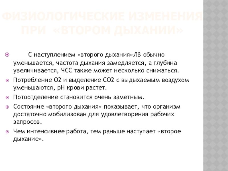Слайд 10Физиологические изменения при «втором дыхании»