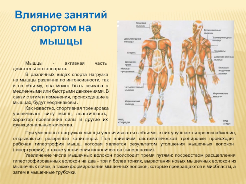видах спорта нагрузка на мышцы различна по интенсивности, так и по объему, она может быть связана с медленными или быстрыми движениями. В связи с этим и изменения, происходящие в мышцах, будут неодинаковы .