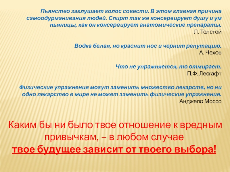 Слайд 41Пьянство заглушает голос совести. В этом главная причина самоодурманивания людей. Спирт