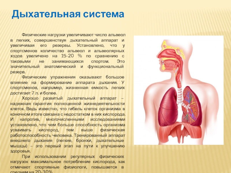 Физические упражнения вызывают повышенную потребность организма в кислороде. В результате чего увеличивается “жизненная ёмкость” лёгких, улучшается подвижность грудной клетки. Кроме того, полное расправление лёгких ликвидирует застойные явления в них, скопление слизи и мокроты, т.е. служит профилактикой возможных заболеваний. Лёгкие при систематических занятиях физическими упражнениями увеличиваются в объёме, дыхание становится более редким и глубоким, что имеет большое значение для вентиляции лёгких.
