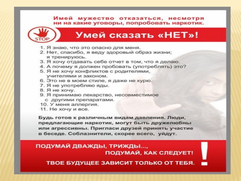 и наркотики лишь сокращают нашу и без того короткую жизнь. Наверно каждый человек хочет увидеть своих внуков, понянчиться с ними. Поэтому будьте благоразумными, сделайте правильный выбор.
