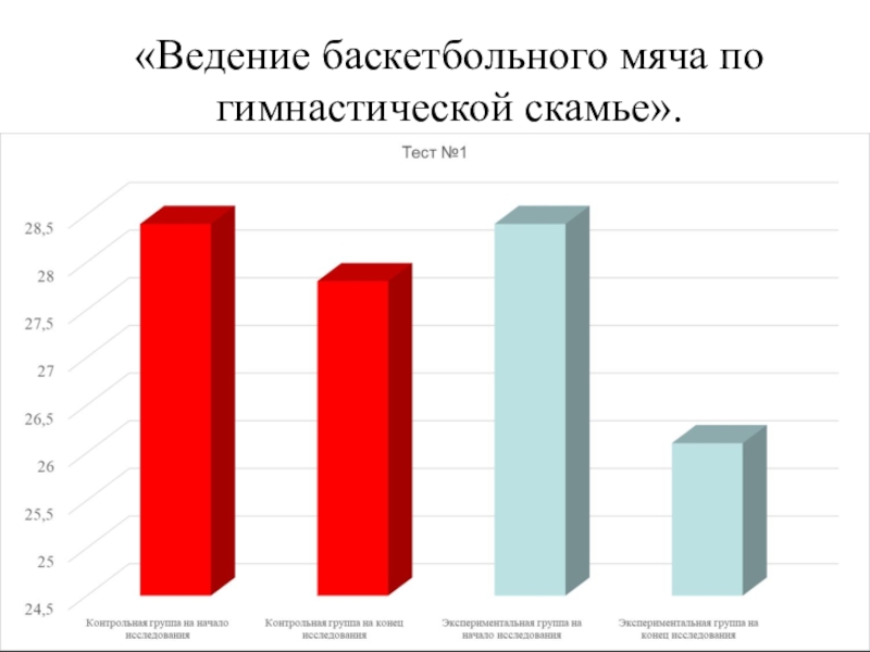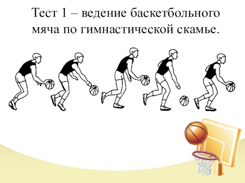 Слайд 6Тест 1 – ведение баскетбольного мяча по гимнастической скамье.