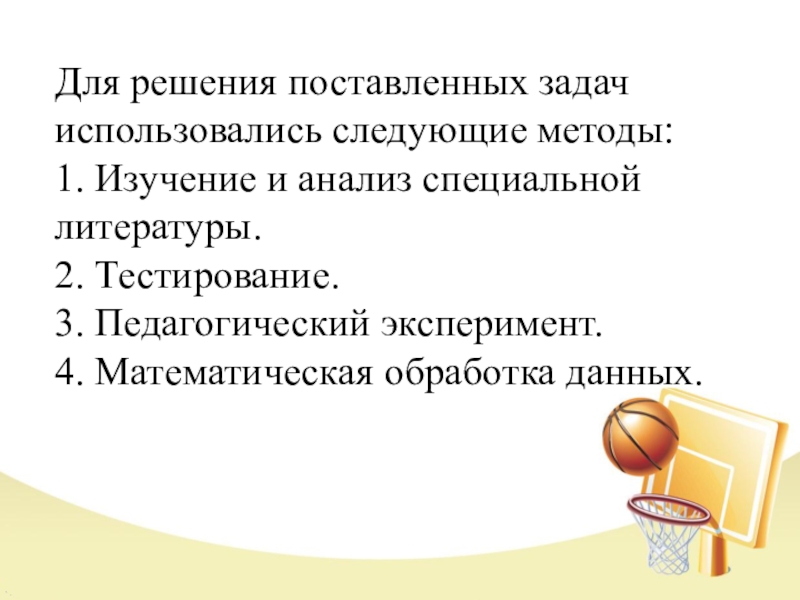 Для решения поставленных задач использовались следующие методы: 1. Изучение и анализ специальной литературы. 2. Тестирование. 3. Педагогический