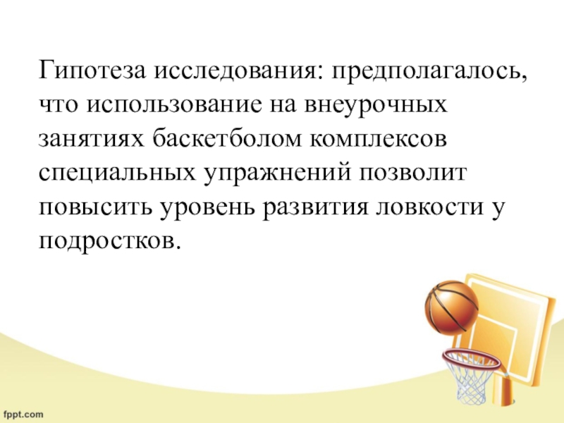 Слайд 3Гипотеза исследования: предполагалось, что использование на внеурочных занятиях баскетболом комплексов специальных