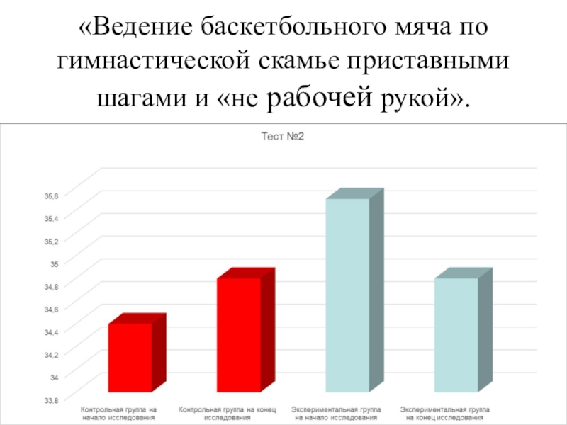 Слайд 7Тест 2 – ведение баскетбольного мяча по гимнастической скамье, приставными шагами