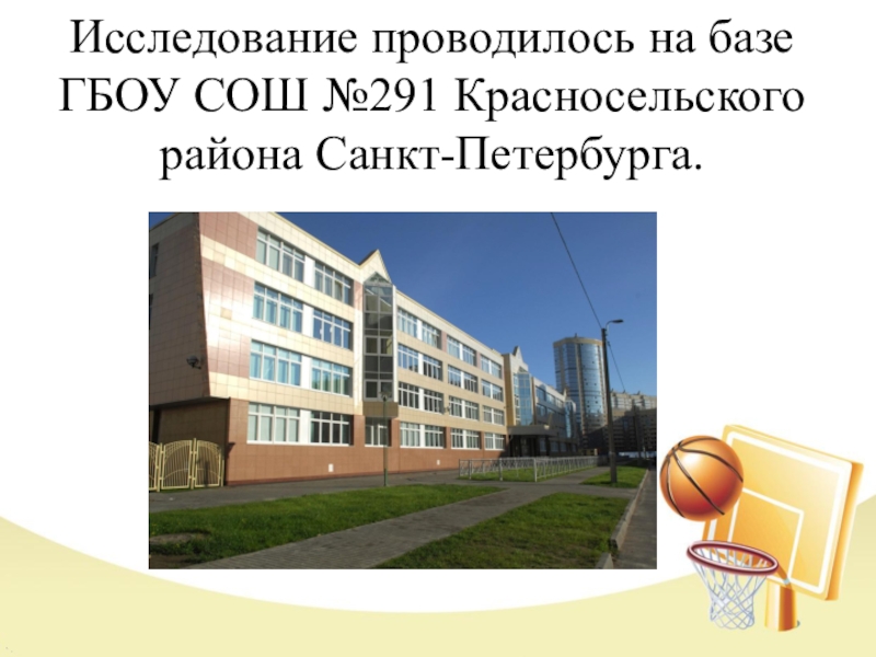 Слайд 5Исследование проводилось на базе ГБОУ СОШ №291 Красносельского района Санкт-Петербурга.