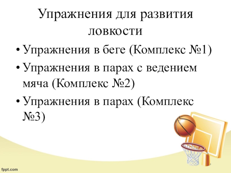 Упражнения для развития ловкостиУпражнения в беге (Комплекс №1)Упражнения в парах с ведением мяча (Комплекс №2)Упражнения в парах