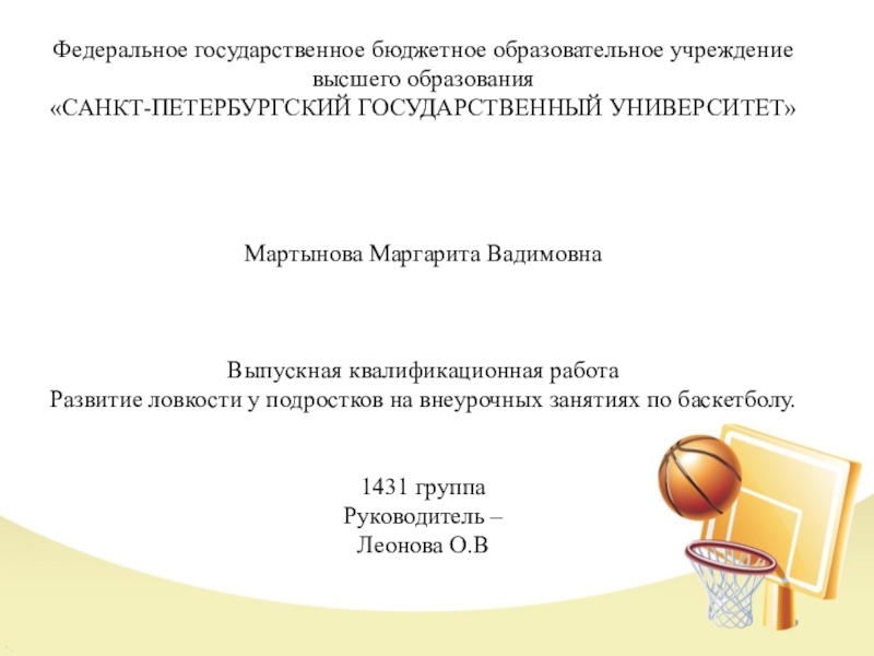 Презентация, доклад на тему Выпускной квалификационной работы: Развитие ловкости у подростков на внеурочных занятиях по баскетболу
