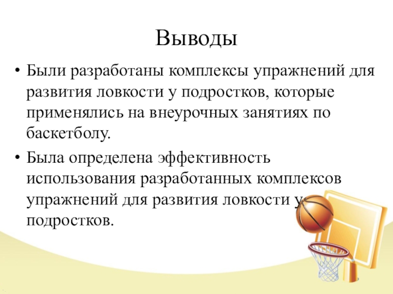 ВыводыБыли разработаны комплексы упражнений для развития ловкости у подростков, которые применялись на внеурочных занятиях по баскетболу.Была определена