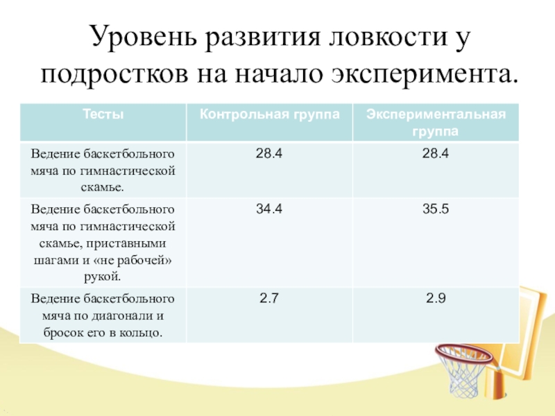 Был определен исходный уровень развития ловкости у подростков в экспериментальной и контрольной группе.