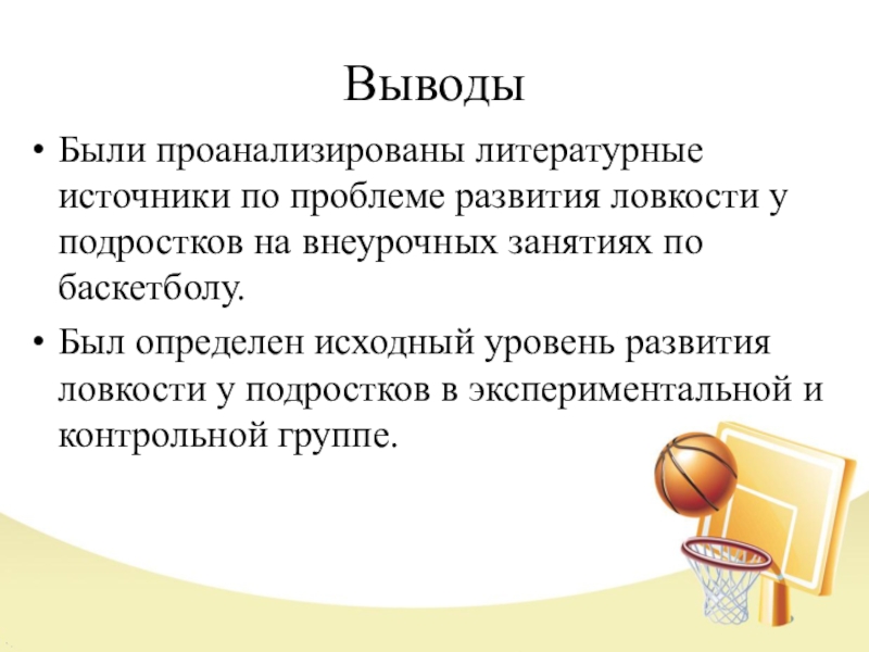 ВыводыБыли проанализированы литературные источники по проблеме развития ловкости у подростков на внеурочных занятиях по баскетболу.Был определен исходный