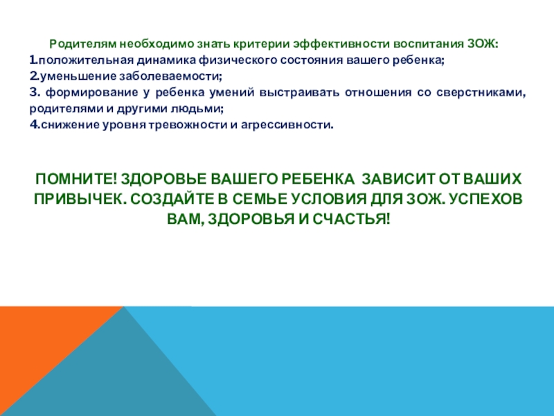 Слайд 12 Родителям необходимо знать критерии эффективности воспитания ЗОЖ: