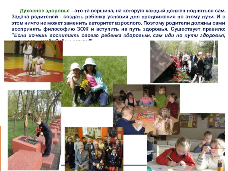 вершина, на которую каждый должен подняться сам. Задача родителей - создать ребенку условия для продвижения по этому пути. И в этом ничто не может заменить авторитет взрослого. Поэтому родители должны сами воспринять философию ЗОЖ и вступить на путь здоровья. Существует правило: "Если хочешь воспитать своего ребенка здоровым, сам иди по пути здоровья, иначе его некуда будет вести!".