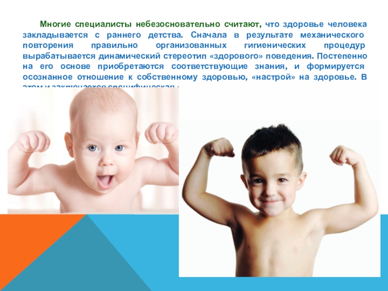 человека закладывается с раннего детства. Сначала в результате механического повторения правильно организованных гигиенических процедур вырабатывается динамический стереотип «здорового» поведения. Постепенно на его основе приобретаются соответствующие знания, и формируется осознанное отношение к собственному здоровью, «настрой» на здоровье. В этом и заключается специфическая «работа» мозга в управлении здоровьем.