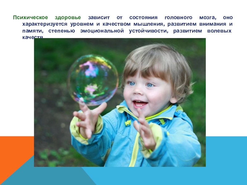 Слайд 6Психическое здоровье зависит от состояния головного мозга, оно характеризуется уровнем и