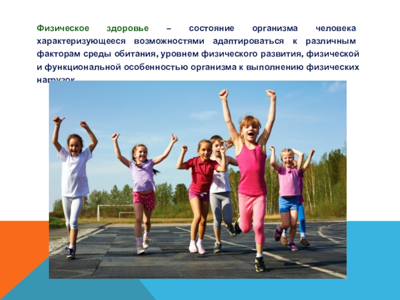 Слайд 5Физическое здоровье – состояние организма человека характеризующееся возможностями адаптироваться к различным
