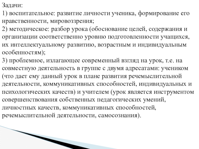 3) проблемное, излагающее современный взгляд на урок, т.е. на совместную деятельность в группе с двумя адресатами: учеником (что дает ему данный урок в плане развития речемыслительной деятельности, коммуникативных способностей, индивидуальных и психологических качеств) и учителем (урок является инструментом совершенствования собственных педагогических умений, личностных качеств, коммуникативных способностей, речемыслительной деятельности, самосознания).
