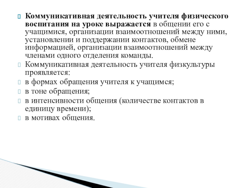 Слайд 6Коммуникативная деятельность учителя физического воспитания на уроке выражается в общении его