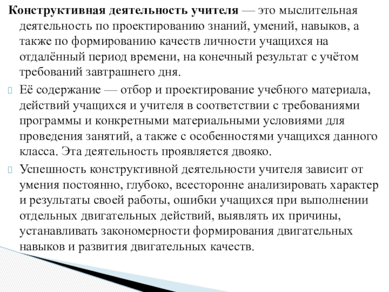 Слайд 4Конструктивная деятельность учителя — это мыслительная деятельность по проектированию знаний, умений, навыков,