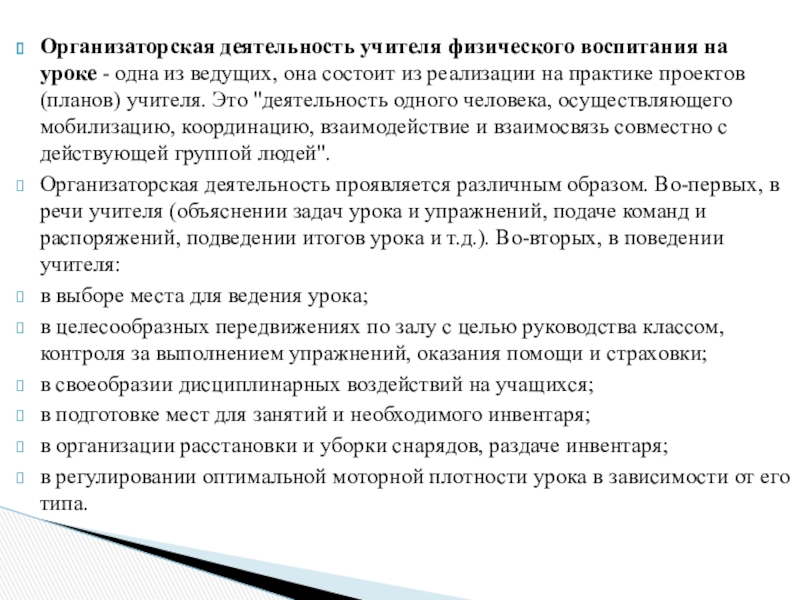 Слайд 5Организаторская деятельность учителя физического воспитания на уроке - одна из ведущих, она