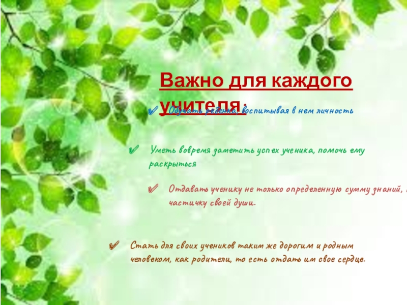 Стать для своих учеников таким же дорогим и родным человеком, как родители, то есть отдать им свое сердце.