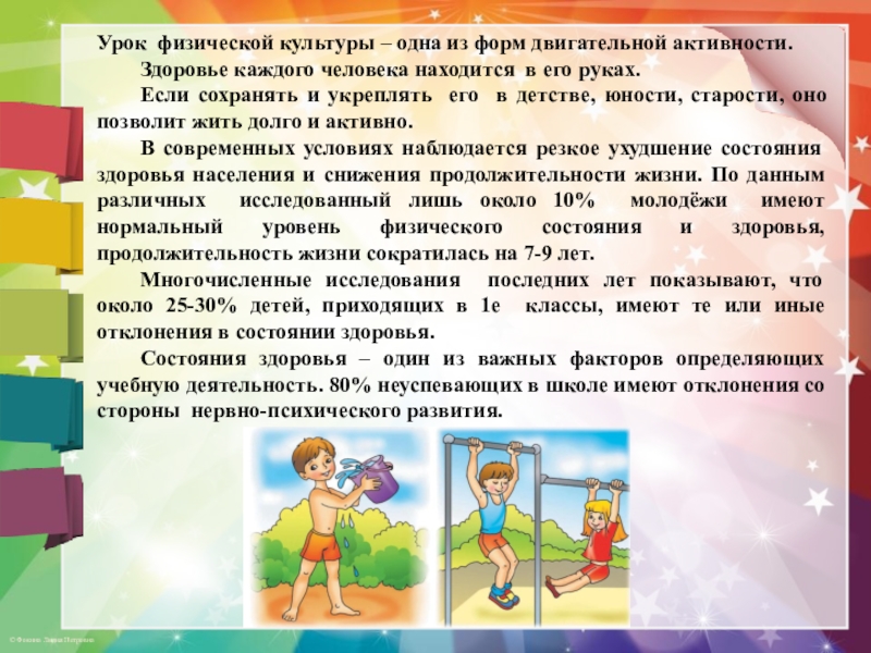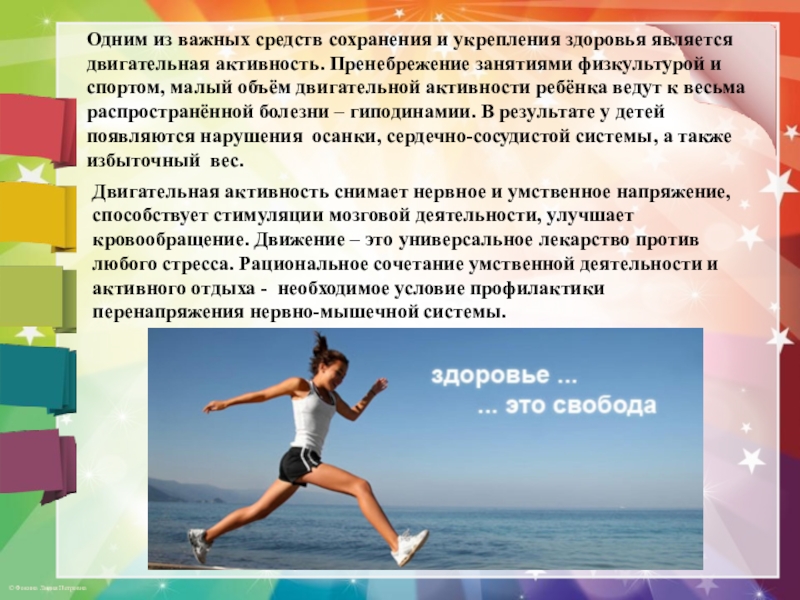 Двигательная активность снимает нервное и умственное напряжение, способствует стимуляции мозговой деятельности, улучшает кровообращение. Движение – это универсальное лекарство против любого стресса. Рациональное сочетание умственной деятельности и активного отдыха - необходимое условие профилактики перенапряжения нервно-мышечной системы.