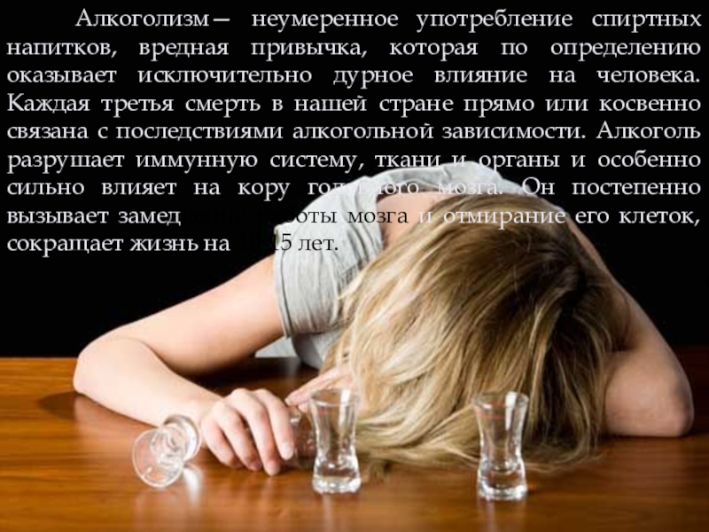 определению оказывает исключительно дурное влияние на человека. Каждая третья смерть в нашей стране прямо или косвенно связана с последствиями алкогольной зависимости. Алкоголь разрушает иммунную систему, ткани и органы и особенно сильно влияет на кору головного мозга. Он постепенно вызывает замедление работы мозга и отмирание его клеток, сокращает жизнь на 10-15 лет.