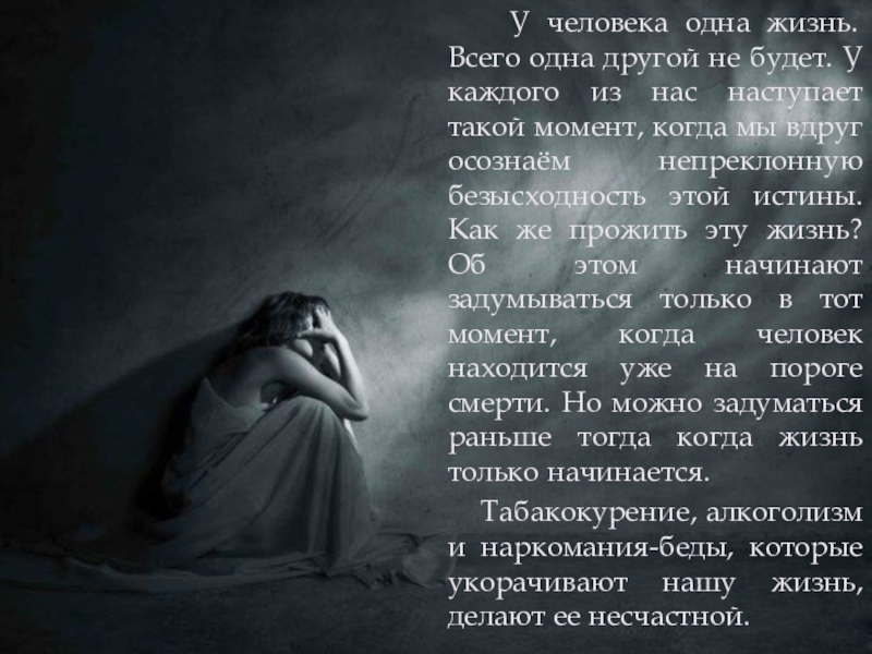 Слайд 3 У человека одна жизнь. Всего одна другой не будет.