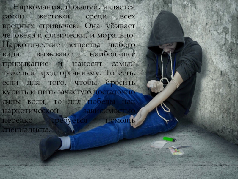 Слайд 7 Наркомания, пожалуй, является самой жестокой среди всех вредных привычек.