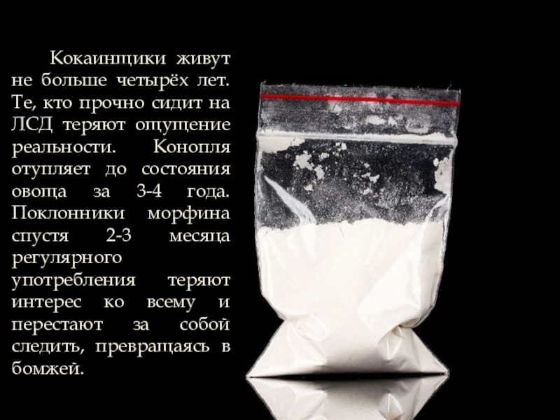 Слайд 9 Кокаинщики живут не больше четырёх лет. Те, кто прочно