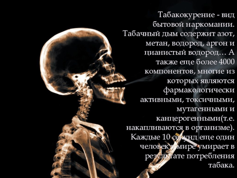 Слайд 4 Табакокурение - вид бытовой наркомании. Табачный дым содержит азот,