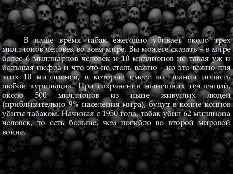 человек во всем мире. Вы можете сказать – в мире более 6 миллиардов человек и 10 миллионов не такая уж и большая цифра и что это не столь важно – но это важно для этих 10 миллионов, в которые имеет все шансы попасть любой курильщик. При сохранении нынешних тенденций, около 500 миллионов из ныне живущих людей (приблизительно 9% населения мира), будут в конце концов убиты табаком. Начиная с 1950 года, табак убил 62 миллиона человек, то есть больше, чем погибло во второй мировой войне.
